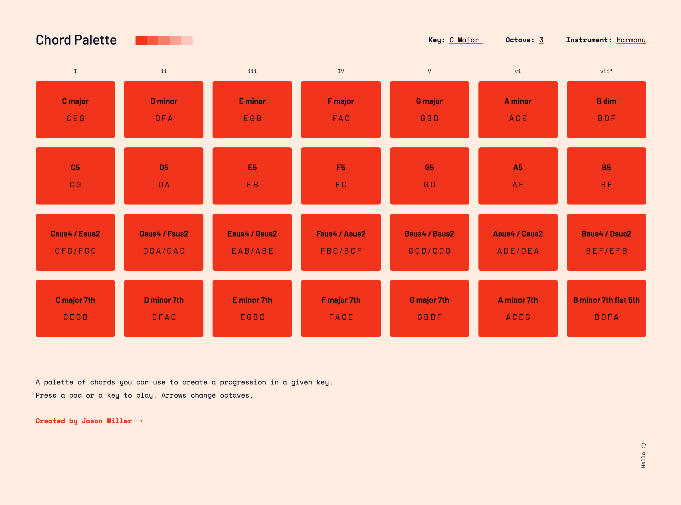 I designed and developed Chord Palette, an online tool for composing chord progressions (and improving my understanding of music theory).