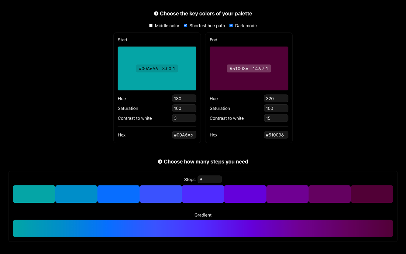 A tool for building color palettes with even perceptual contrast between steps.