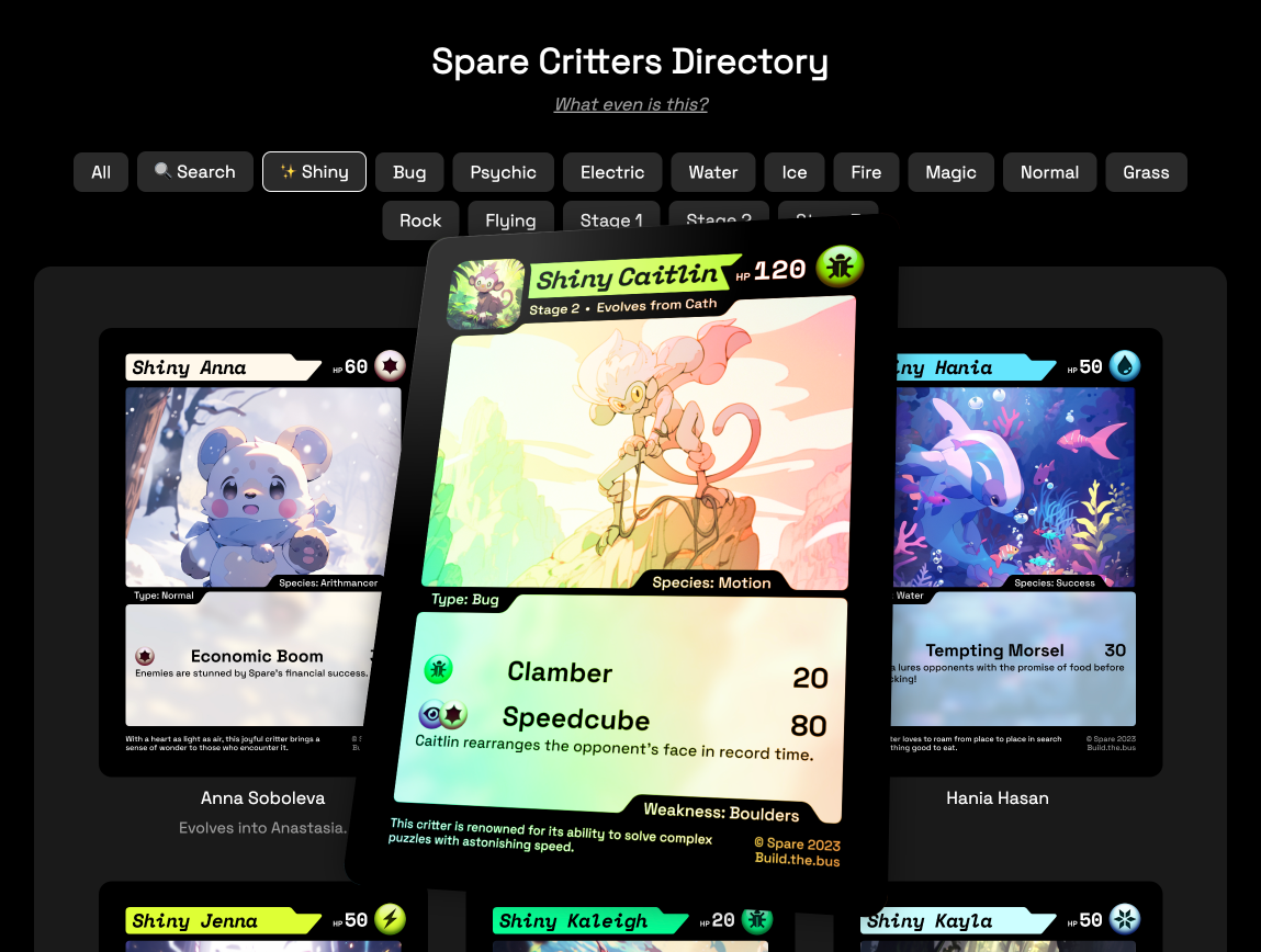 To celebrate a company milestone, I created a custom Pokemon-style card for each employee at Spare. I had physical cards made and gave them away as swag, but I also created a directory of every card using React and some pretty tricky CSS to simulate the effect of real cards catching the light. Check out the shiny ones in particular!